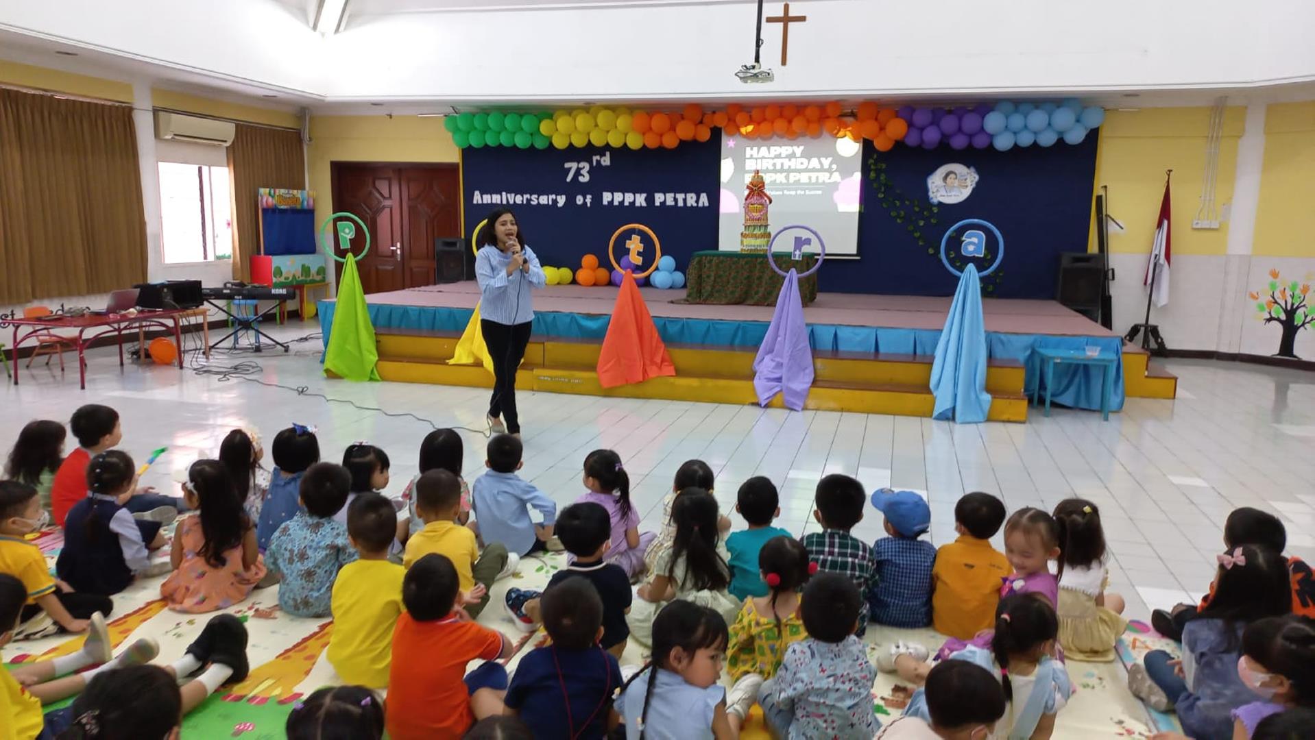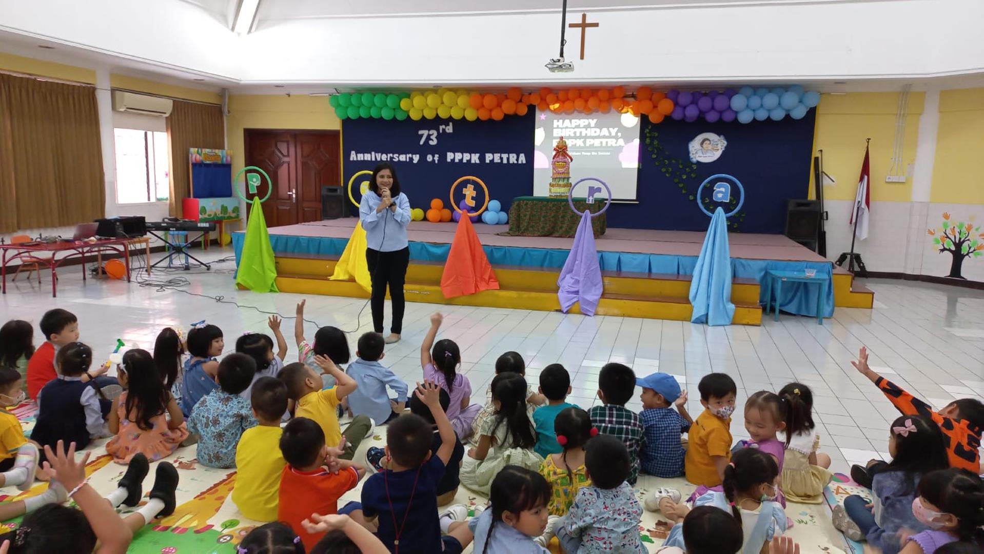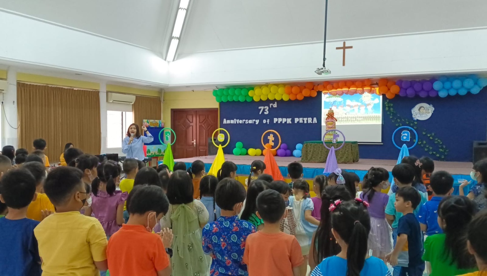 Happy birthday, Petra… Happy birthday Petra! Begitu meriah lagu yang dinyanyikan para siswa-siswi, guru dan karyawan KB-TK Kristen Petra 13 dalam menyambut hari jadi ke-73 PPPK Petra. Pagi ini, kami melihat semua warga sekolah menggunakan baju warna-warni sesuai dengan warna PETRA.