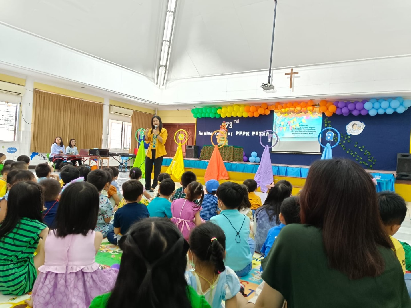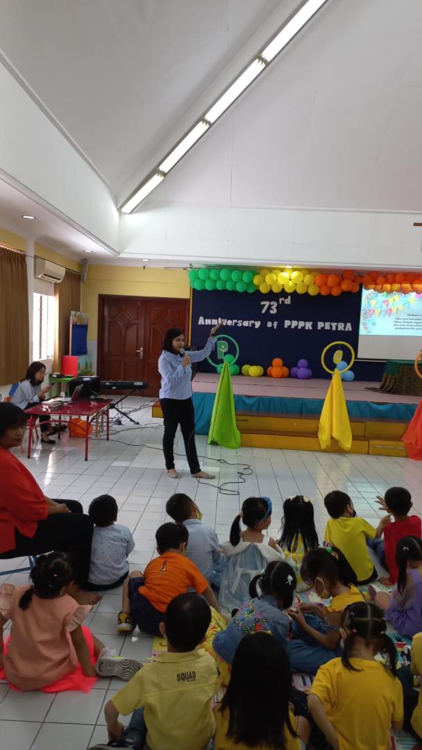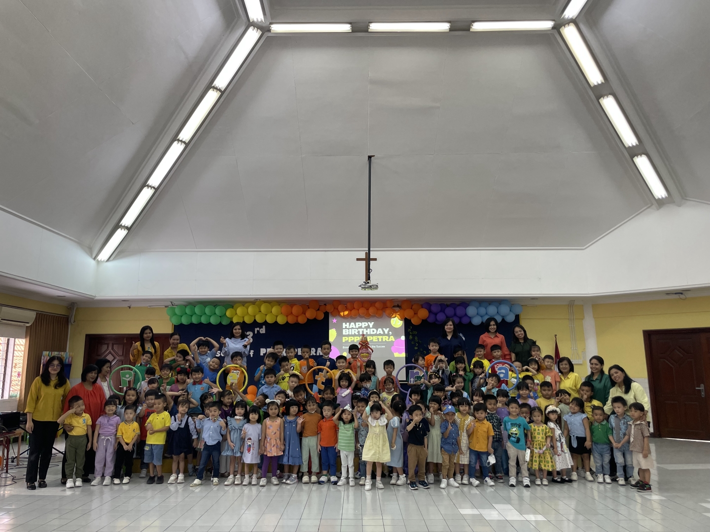 Happy birthday, Petra… Happy birthday Petra! Begitu meriah lagu yang dinyanyikan para siswa-siswi, guru dan karyawan KB-TK Kristen Petra 13 dalam menyambut hari jadi ke-73 PPPK Petra. Pagi ini, kami melihat semua warga sekolah menggunakan baju warna-warni sesuai dengan warna PETRA.
