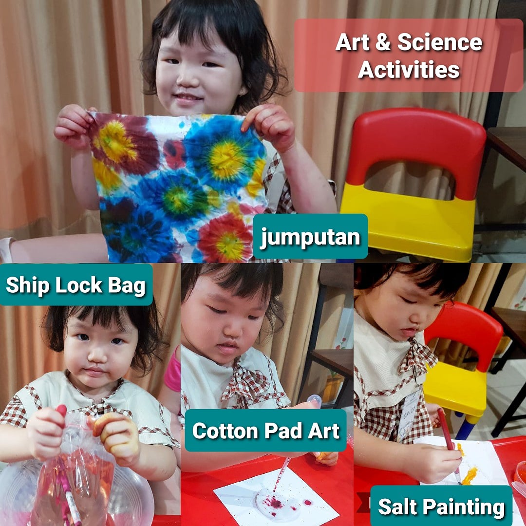 Pada kegiatan art and science, anak-anak mengikuti berbagai macam kegiatan, antara lain: membuat jumputan, cotton pad art, leak proof bag, dan salt painting. Ada beberapa alat peraga dan bahan yang dibutuhkan dapat diambil oleh orang tua siswa di sekolah pada saat hari pembagian materi. Anak-anak sangat antusias mengikuti kegiatan di room ini karena sangat menarik dan membuat mereka penasaran dengan hasilnya.