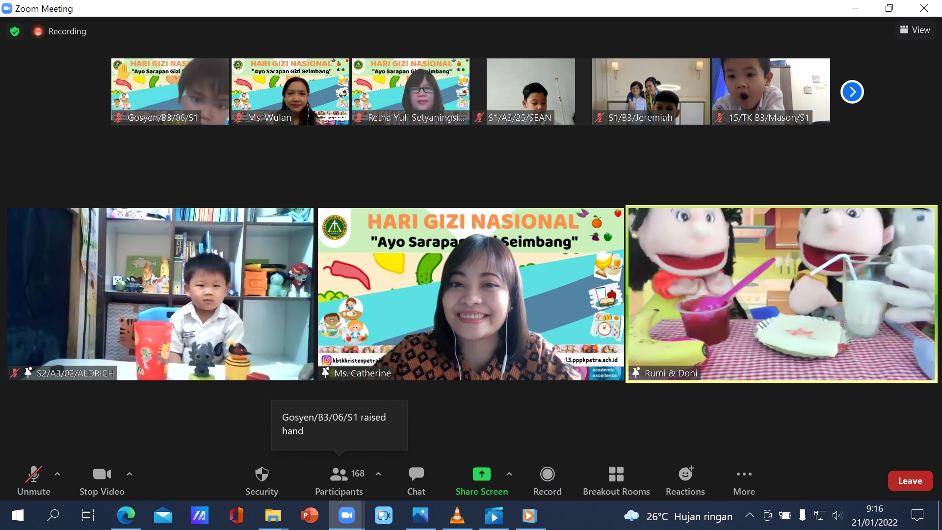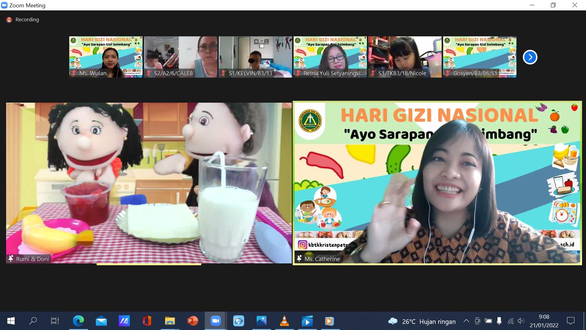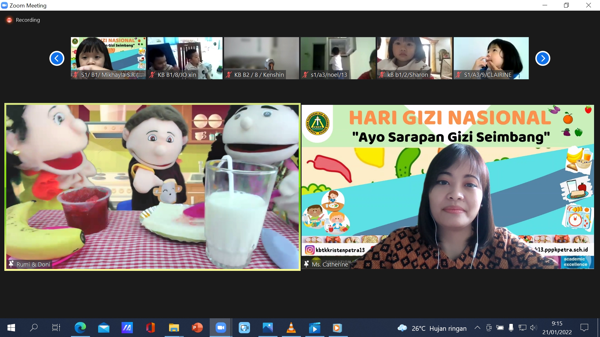 Para siswa merasa senang dalam mengikuti acara tersebut, apalagi mereka dapat berjumpa dengan puppet Rumi dan Doni yang merupakan favorit para siswa di KB -TK Kristen Petra 13. Melalui kegiatan ini, para siswa dihimbau untuk mau sarapan dengan gizi seimbang sebelum mengikuti kegiatan pembelajaran daring dan belajar mandiri serta mampu membantu mama saat menyiapkan sarapan gizi seimbang sehingga dapat menjadi pembiasaan yang baik dan mereka semua menjadi siswa yang sehat dan berprestasi. SELAMAT HARI GIZI NASIONAL. Tuhan Yesus memberkati.