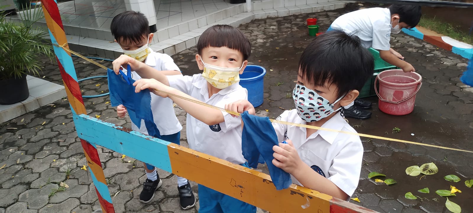 Tidak hanya secara teori, para siswa juga diajak untuk berpraktik langsung dengan melakukan beberapa kegiatan yang dapat dilakukan saat musim kemarau seperti mencuci serta menjemur pakaian, sapu tangan, bermain di halaman (seperti mengambil dan menuang air dari bak ke ember, bermain gelembung, layang-layang di luar kelas / taman sekolah). Para siswa sangat senang ketika diajak untuk membuat gelembung sehingga mereka belajar bagaimana cara membuat gelembung. Mulai dari sabun cuci tangan yang dicampur dengan air, lalu dihembuskan udara pada alat peniup gelembung. Ada juga kegiatan bermain layang-layang, anak-anak belajar membuat layang-layang sendiri secara sederhana dengan bahan kertas berwarna yang berbentuk burung. Sebelum itu, Ibu guru menceritakan pada anak-anak tentang buku cerita yang berjudul “Terbanglah Layang-layang”. Setelah layang-layang yang mereka buat jadi, para siswa mulai mencoba menerbangkan layang-layang bersama teman-teman. Mereka sangat gembira sekali saat layang-layang buatan mereka sendiri dapat terbang ke angkasa.
