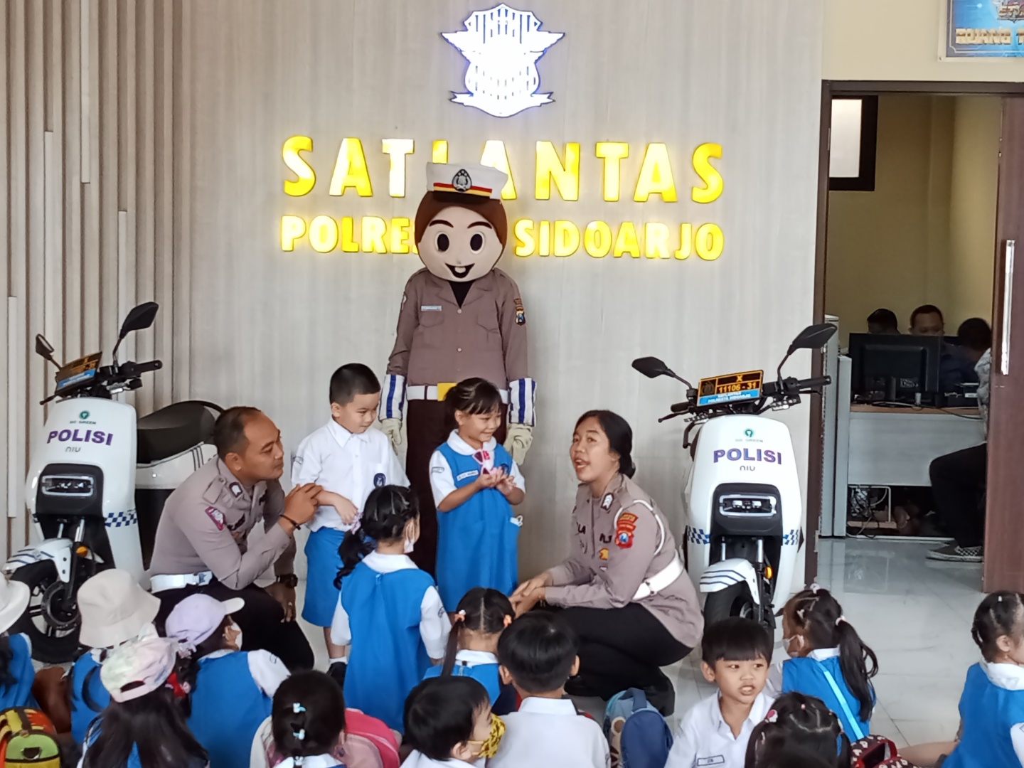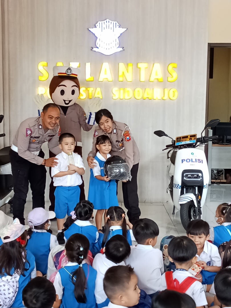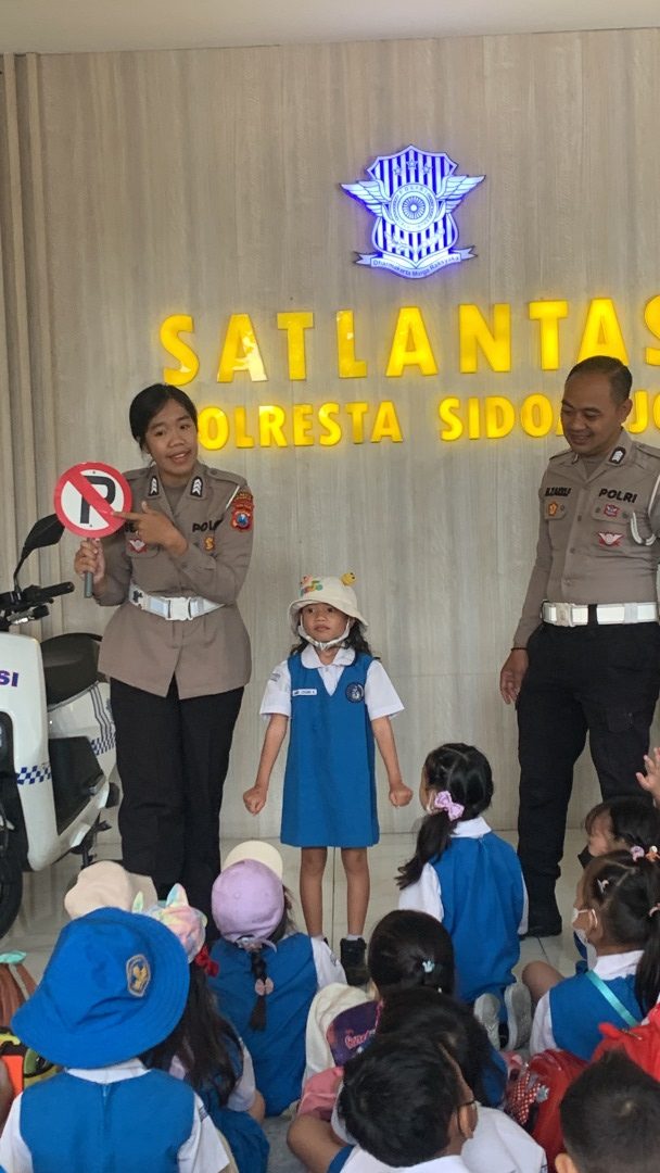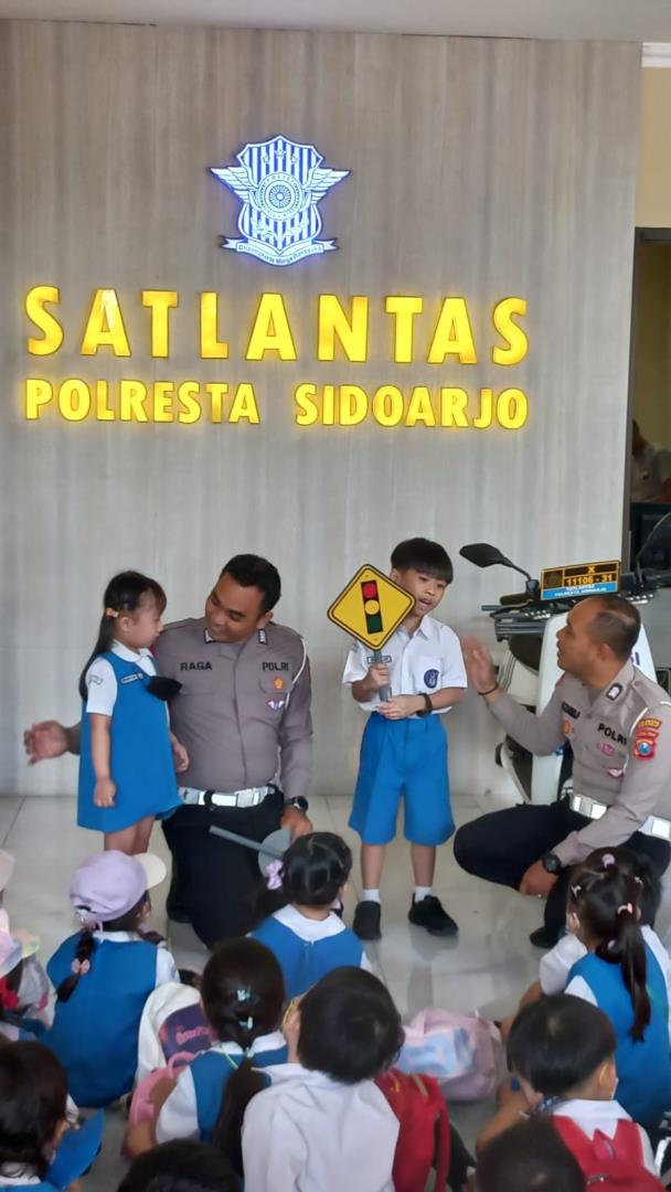 Setelah sampai di Polresta Sidoarjo, saya berkumpul dengan teman – teman saya yang lain. Bapak dan Ibu polisi bercerita banyak tentang pekerjaannya. Salah satunya adalah macam – macam rambu – rambu lalu lintas yang ada di jalan. Ternyata banyak sekali rambu – rambu lalu lintas, seperti dilarang masuk, dilarang parkir, jalur penyerbangan dan lain – lain. Tidak hanya menjelaskan, Bapak dan Ibu polisi juga memberi berbagai pertanyaan dengan cara yang menarik tentang keamanan di jalan. Jika bisa menjawab, kita dapat hadiah dari polisi, sehingga anak-anak menjadi semakin semangat untuk menjawab pertanyaan tersebut.