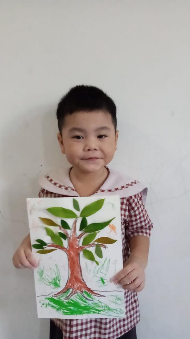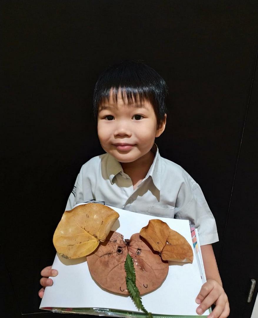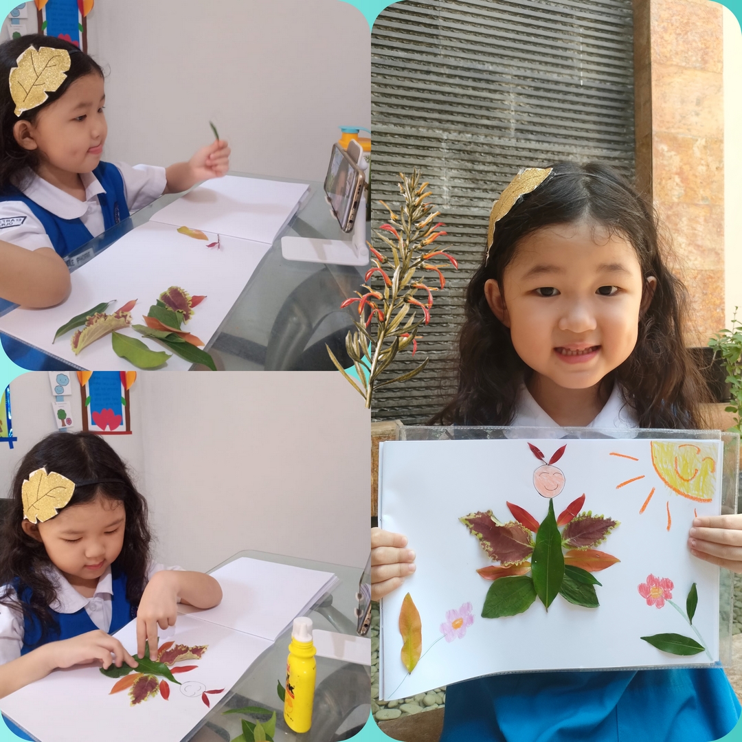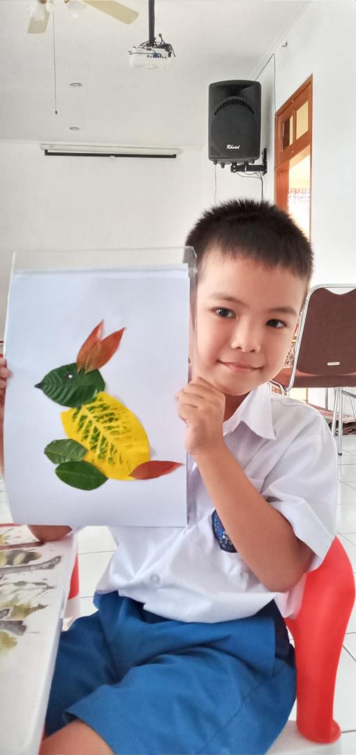 Teman-teman, ternyata kalau kita mau belajar itu tidak harus memakai bahan-bahan yang mahal lho, kita bisa menggunakan bahan yang sudah ada di lingkungan atau alam sekitar kita. Misalnya seperti hari ini, aku belajar menggunakan daun-daunan yang sudah aku kumpulkan, selain belajar aku juga bisa membuat karya seni yang indah. Selamat mencoba di rumah teman-teman, Tuhan memberkati.