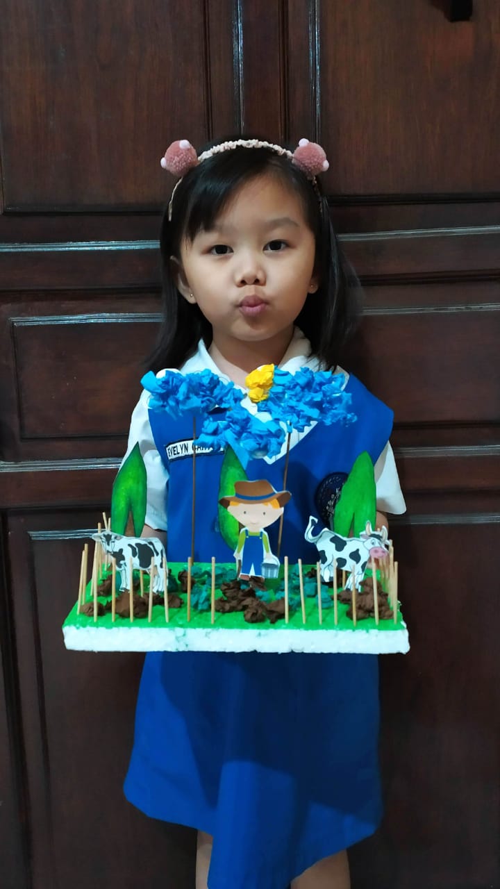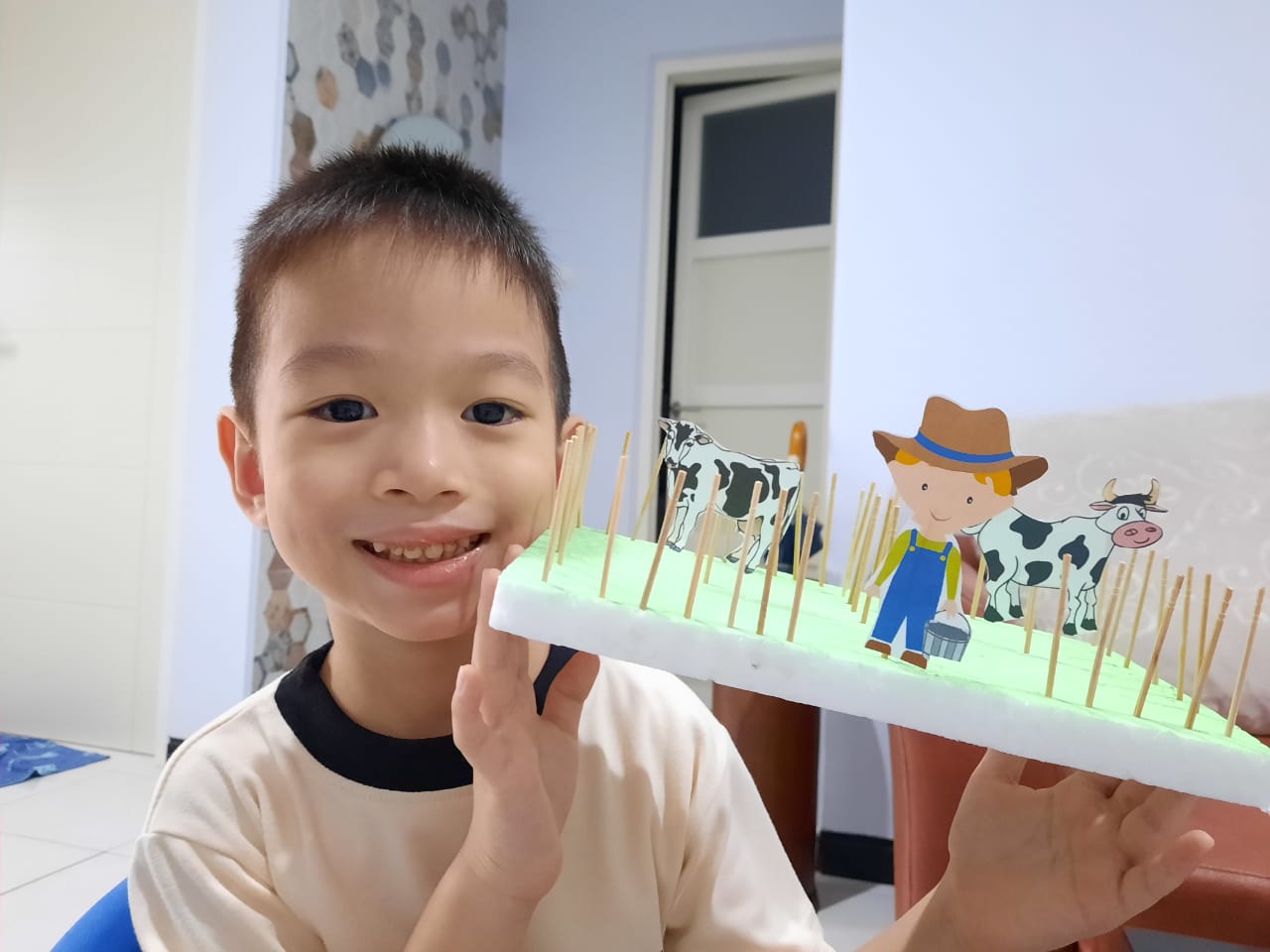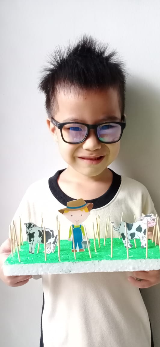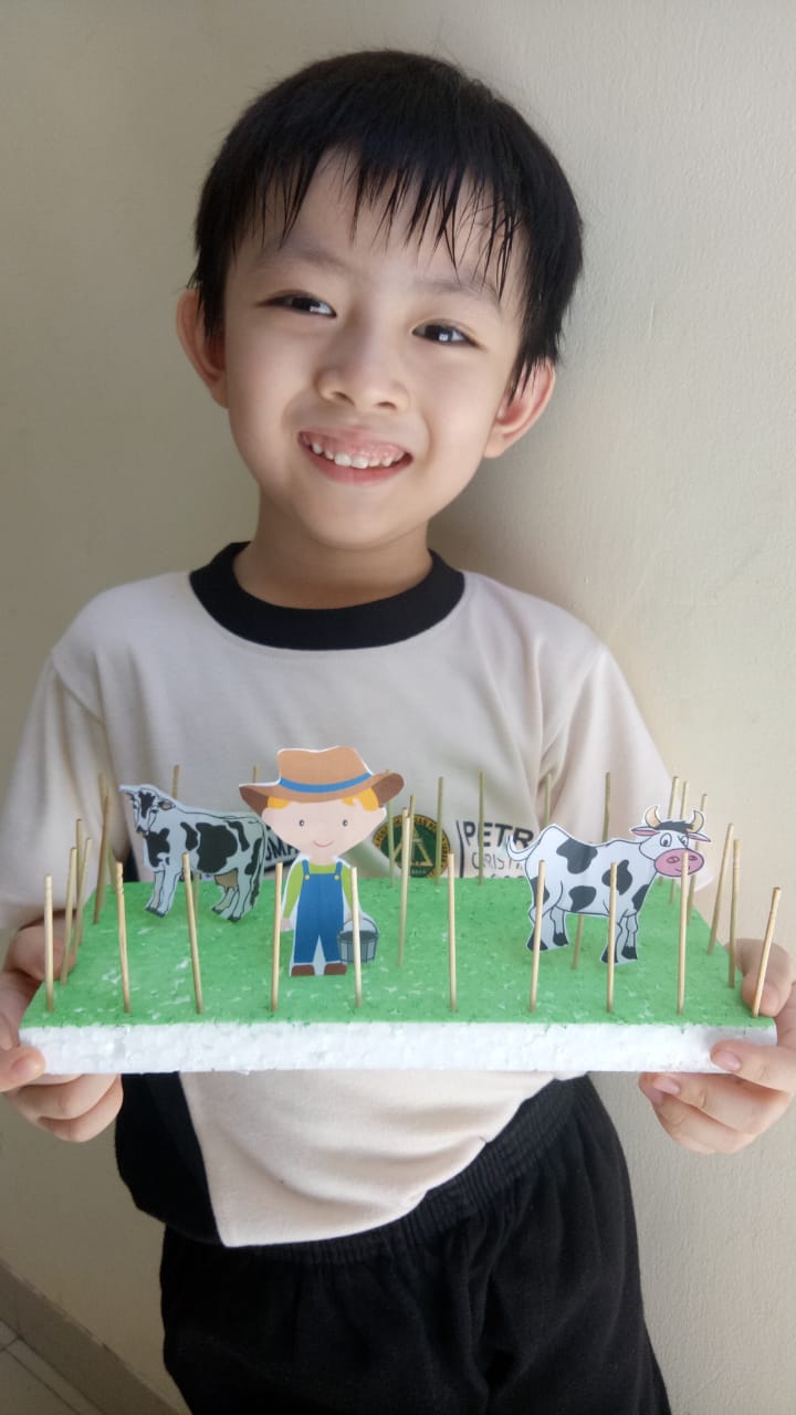 Salah satu contohnya, anak-anak TK B membuat kandang sapi dengan menggunakan alat dan bahan yang sederhana seperti styrofoam, tusuk gigi, dan berbagai macam gambar misalnya sapi dan gembala sapi. Oh iya, alat dan bahannya kami dapat dari sekolah lho, jadi kami hanya merangkai saja sesuai dengan kreativitas kami. Cara pembuatannya juga sangat mudah. Pertama, tusuk gigi kami gunakan sebagai pagar dan ditancapkan pada styrofoam yang berfungsi sebagai pembatas area peternakan. Kedua, gambar gembala dan sapi, kami letakkan di dalam peternakan. Ternyata mudah dan hasilnya pun bagus sekali! Kami suka sekali kegiatan ini…!