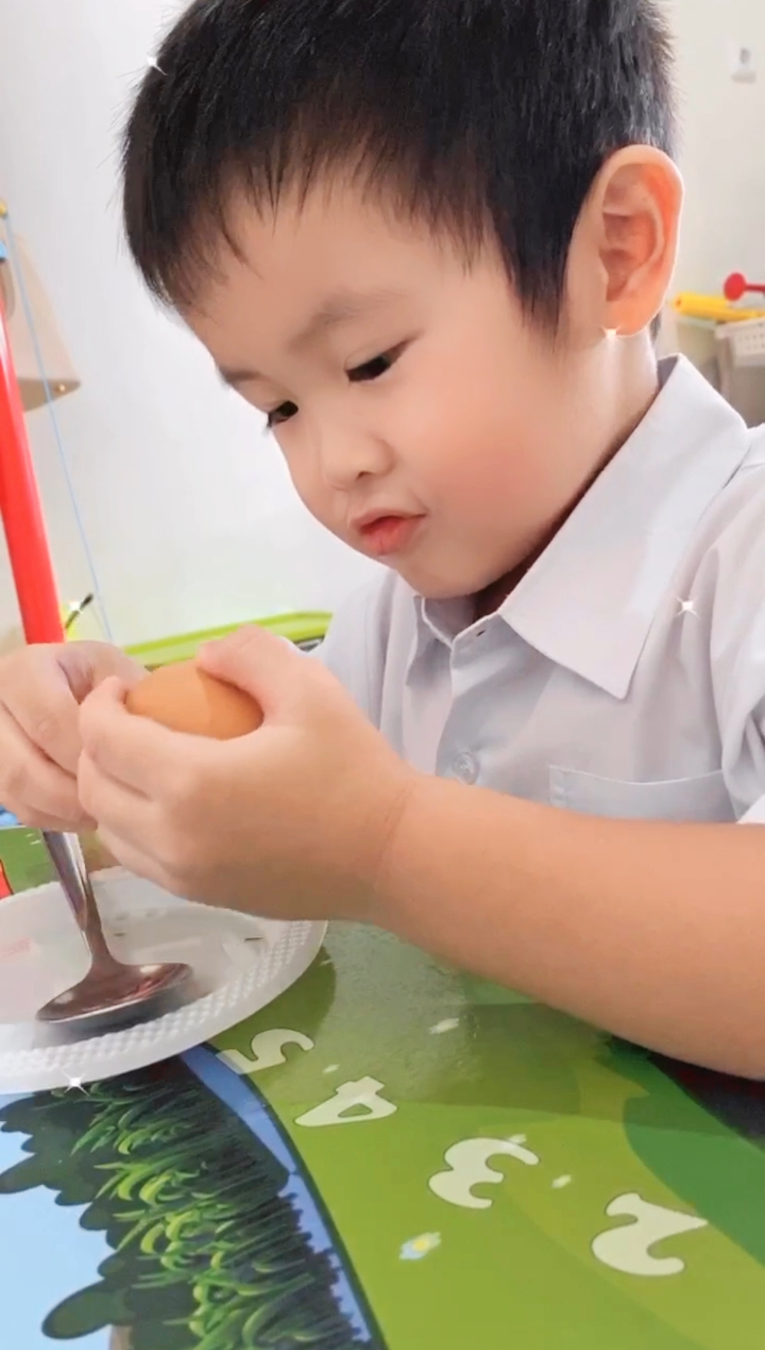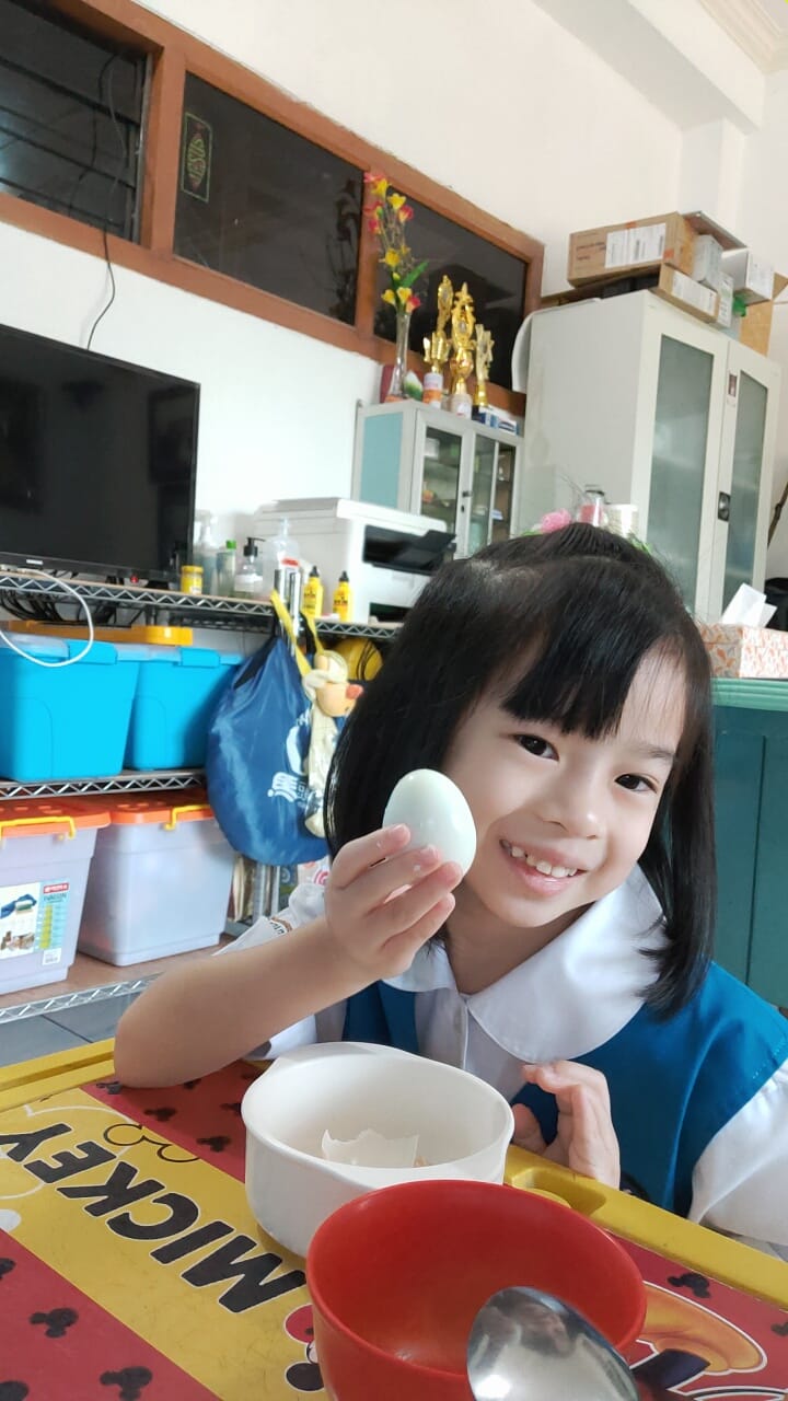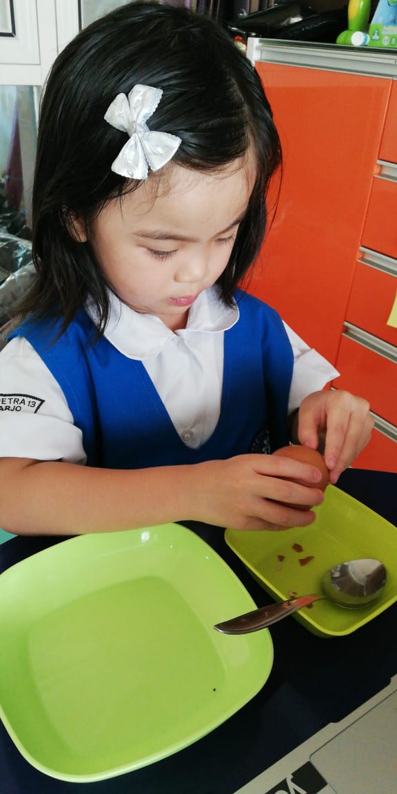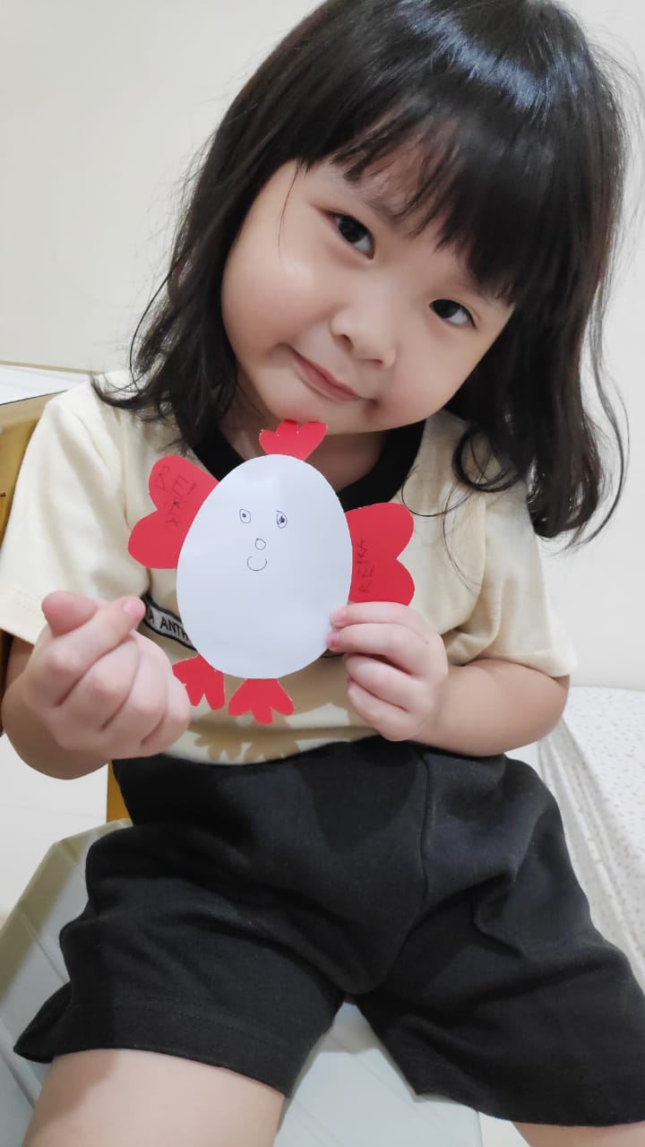 Sedangkan anak-anak A belajar mengenal hewan ternak ayam, mulai dari cara memelihara, menjaga, merawat, serta mengenal produk yang dihasilkan. Setelah itu, kami mengenal bagian-bagian ayam sambil berkreasi membuat bentuk anak ayam dengan menggunakan kertas asturo. Bahan-bahannya juga kami dapat dari sekolah dan kami hanya menempel bentuk badan, jengger, sayap, dan kaki ayam. Hasilnya bagus ya, lucu…!!! Tidak hanya itu, kami pun belajar mengupas telur ayam kemudian dapat kami nikmati saat makan sehat bersama ketika jam istirahat. Hmm, yummy..!
