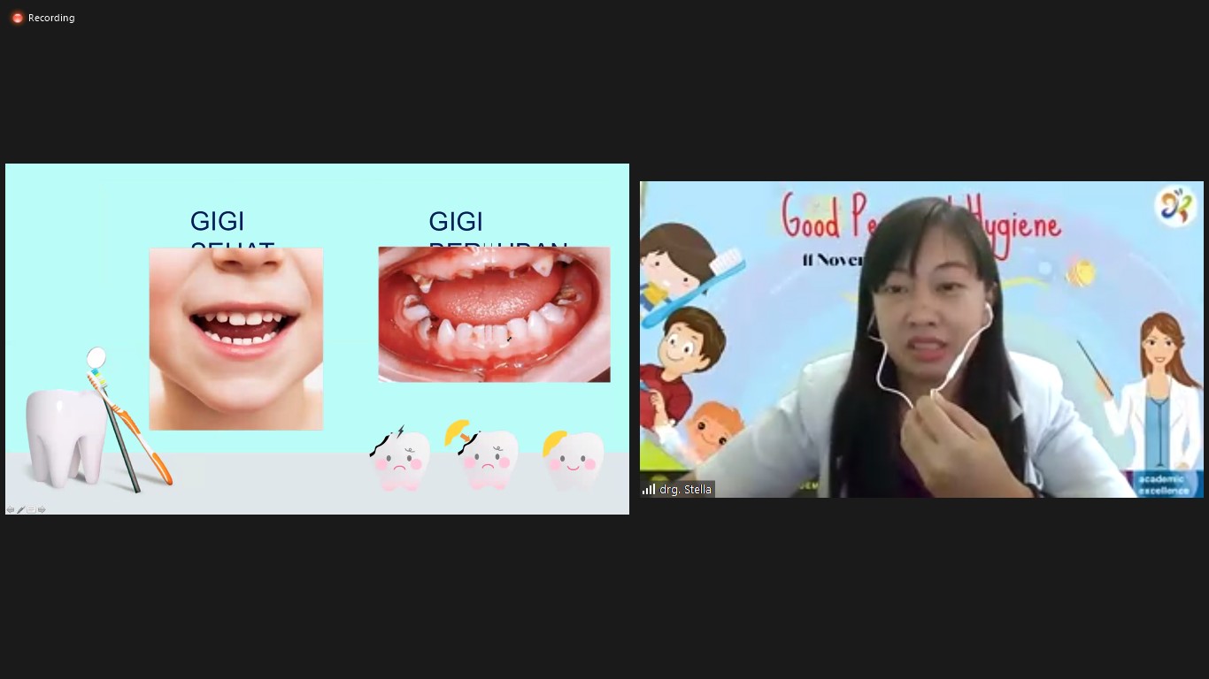 Agar para siswa tidak merasa jenuh, maka anak-anak juga diajak menyanyi dan dance, setelah itu dilanjutkan dengan penyuluhan dari drg. Stella yang menjelaskan tentang guna gigi, cara menjaga kesehatan gigi, cara menggosok gigi. Kemudian dilanjutkan dengan memperagakan cara menggosok gigi yang benar, para siswa pun mengikutinya dengan semangat. Kemudian drg. Stella juga melanjutkan dengan pengarahan agar para siswa suka makan sayur dan buah, minum susu dari gelas, memeriksa kesehatan gigi setiap 6 bulan sekali. Akan tetapi, karena masih dalam masa pandemi, maka kita harus menunda ke dokter gigi kecuali dalam keadaan darurat.