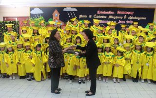 Berani berani sekolah sendiri Tidak ditemani, tidak ditunggui Bermain sendiri, belajar sendiri Berani berani sekolah sendiri Hari ini Senin, 15 Juli 2019 aku sangat gembira berangkat ke KB-TK Kristen Petra 13. Seragam dan tas baruku kupakai dengan bangga, karena aku sudah naik kelas TK A. Aku masuk kelas dengan penuh semangat sedang ibu guruku telah menunggu di depan pintu sambil tersenyum. “Good morning, Miss!” seruku sambil menyalami guru baruku. Guruku membalas salamku
