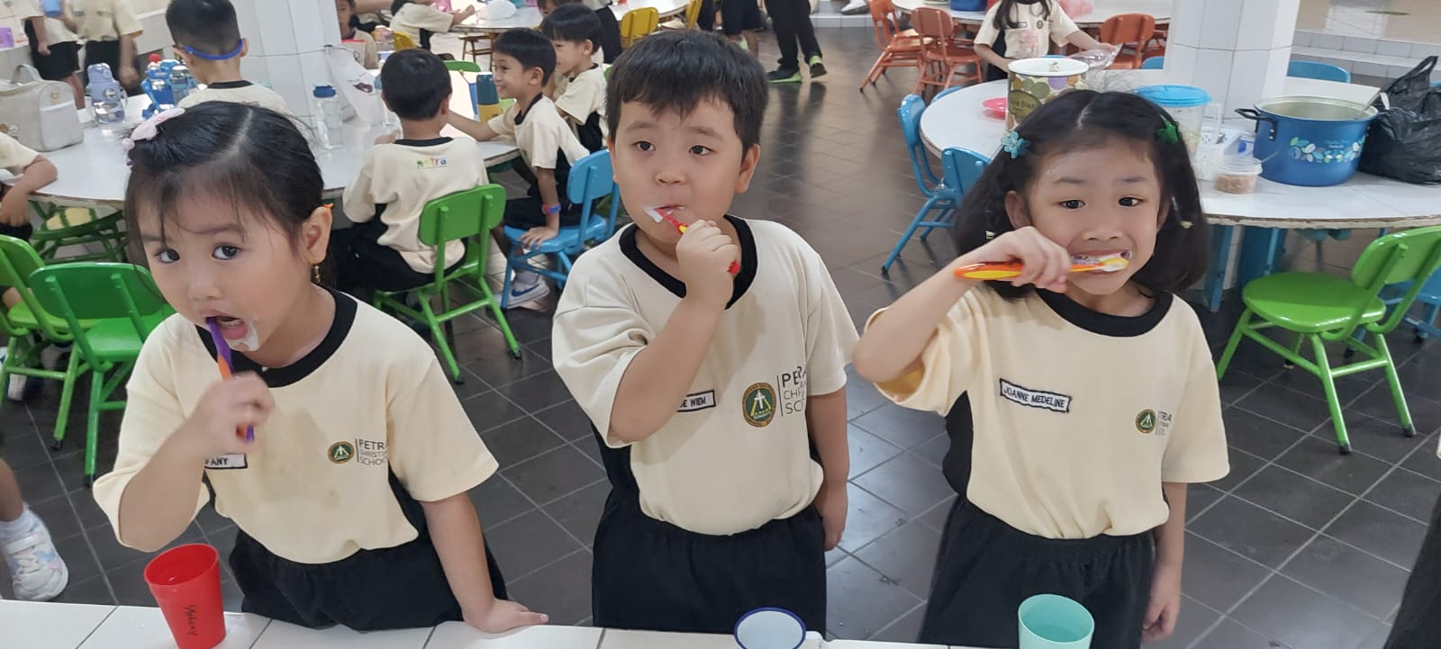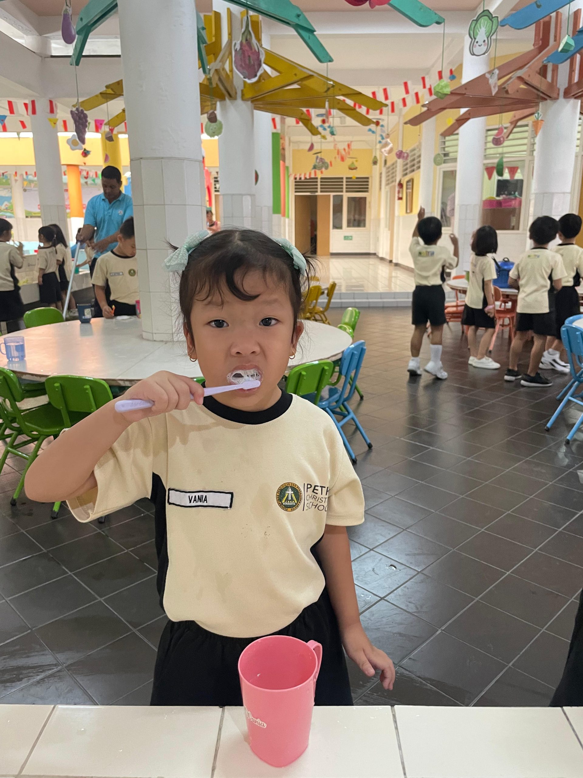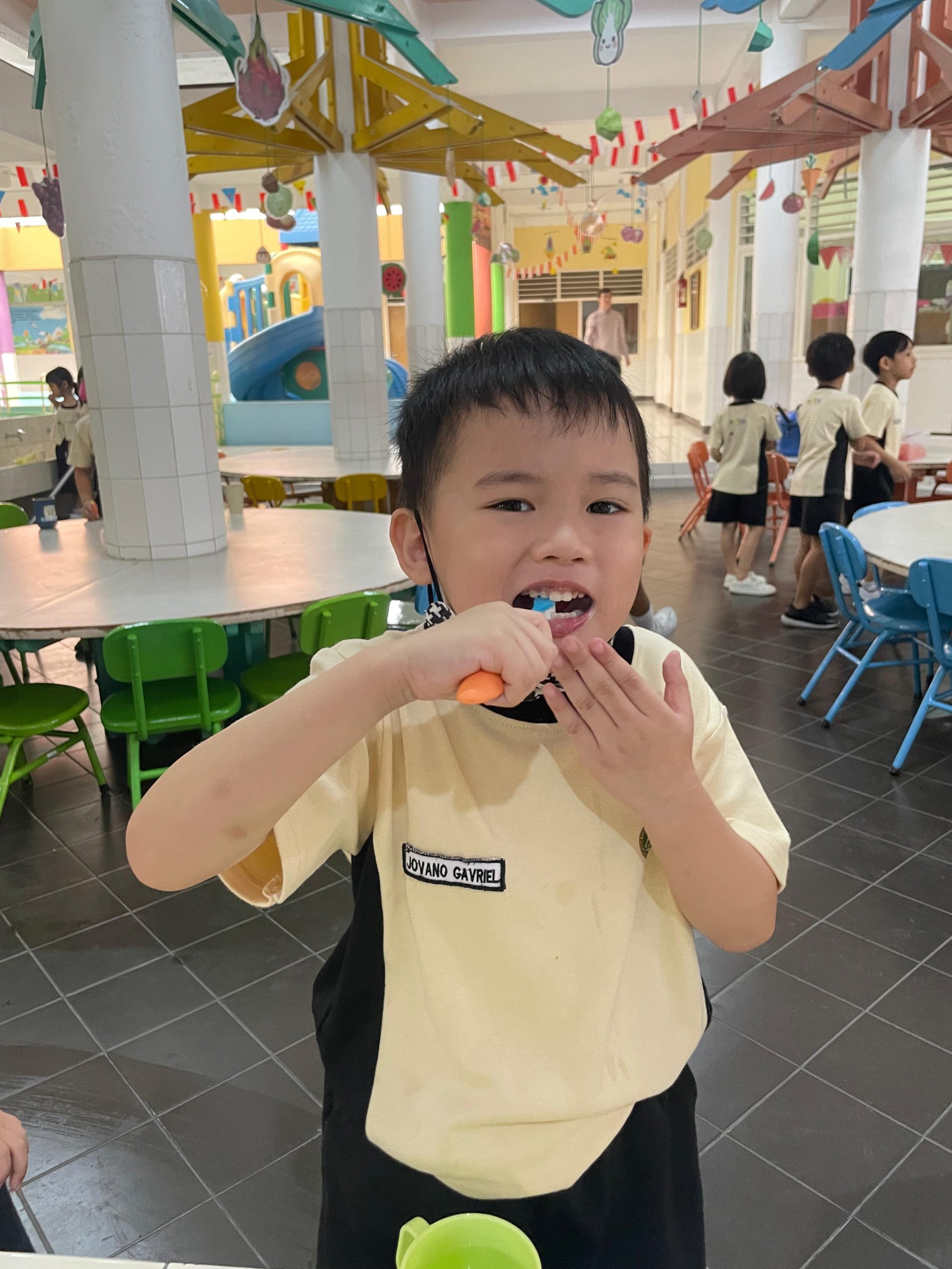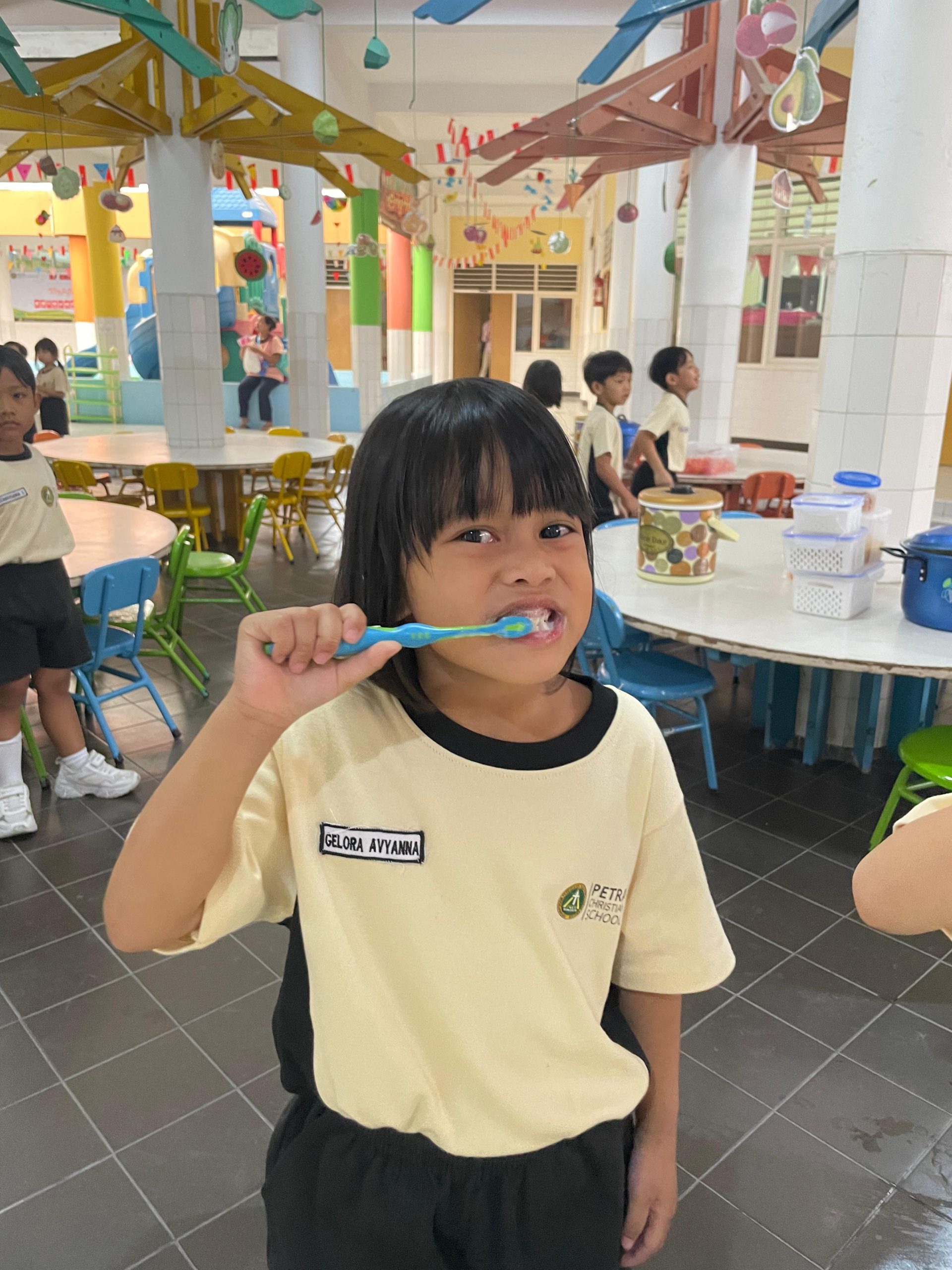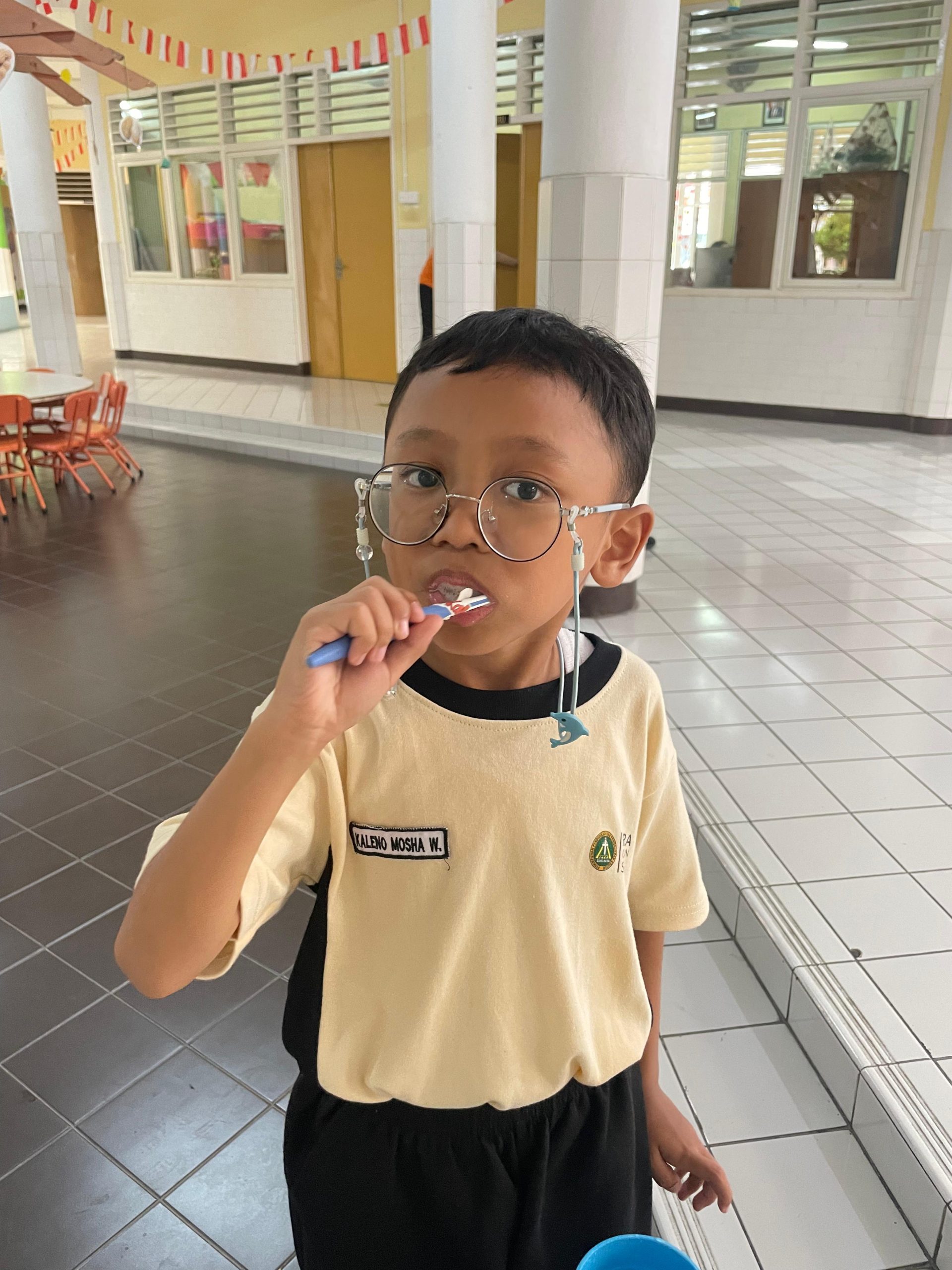 Menjaga kesehatan mulut dan gigi adalah salah satu kebiasaan baik yang harus diajarkan sejak kecil. Maka dari itu, ketika kami selesai makan bersama, kami belajar untuk membereskan peralatan makan, kemudian bersiap untuk menyikat gigi kami. Kami mulai menyikat gigi kami dengan berkumur. Tidak lupa, Ibu guru selalu mengajarkan kami untuk menyikat sikat gigi dengan cara yang baik dan benar seperti yang pernah disampaikan oleh dokter gigi saat penyuluhan gigi saat TK A lalu. Kami merasa senang sekali karena kami dapat praktek langsung bersama dengan teman-teman dan guru di sekolah saat makan bersama dan juga sikat gigi.