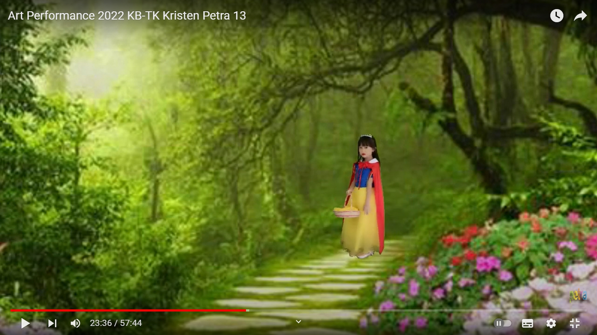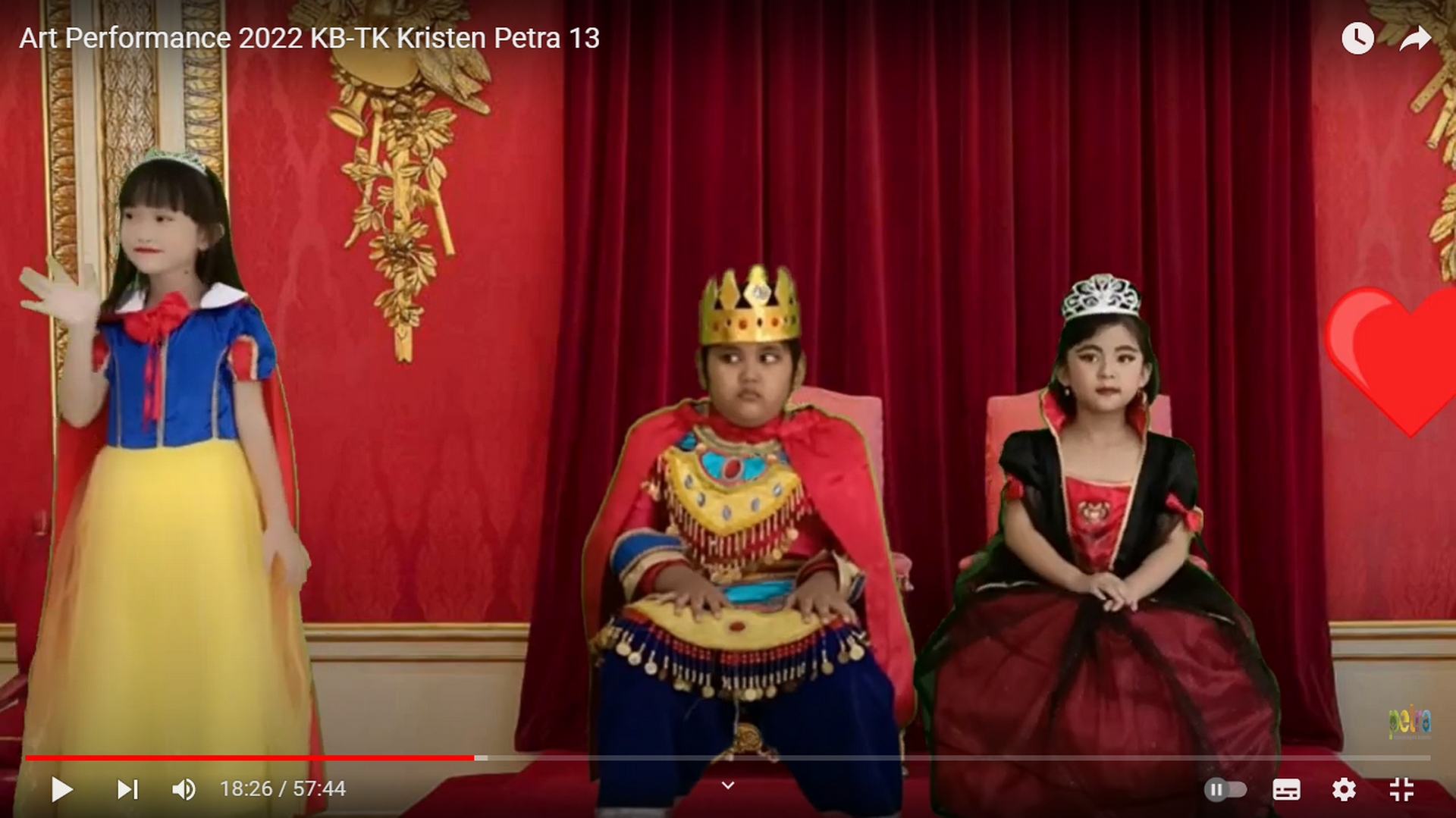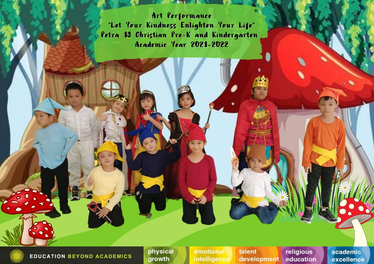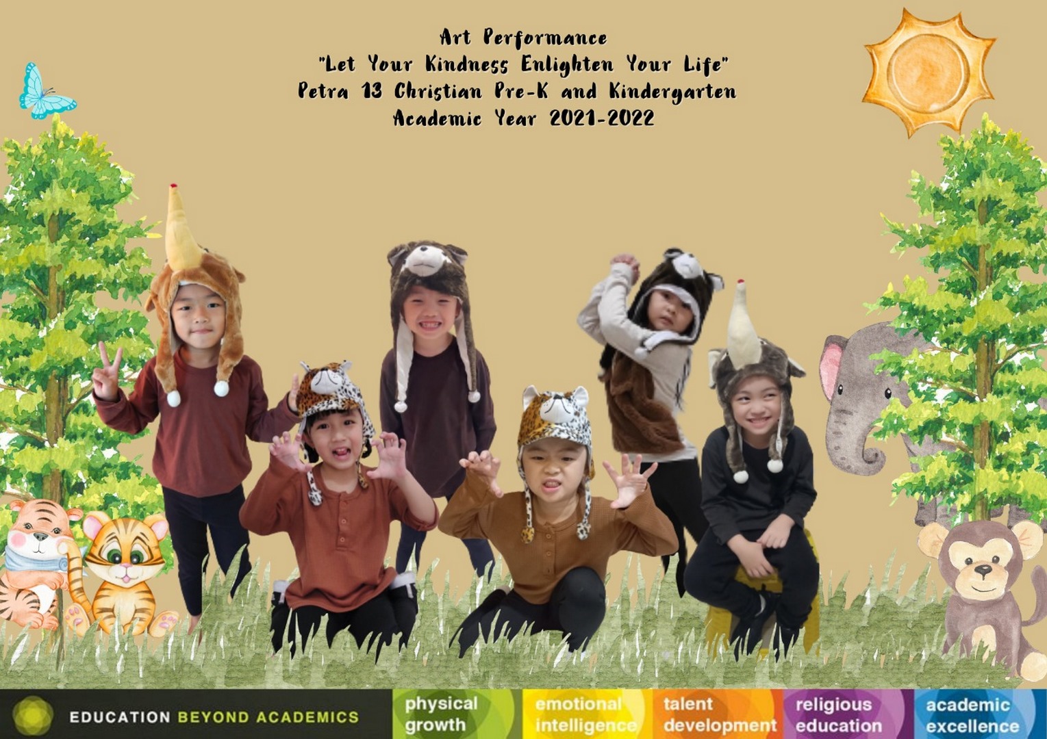 Pada hari Jumat, 3 Juni 2022, KB – TK Kristen Petra 13 menayangkan acara Pentas Seni melalui YouTube TK Kristen Petra 13 PPPK Petra pada pukul 10.00 dengan tema “Let Your Kindness Enlighten Your Life” dengan harapan bahwa kita semua dapat menjadi pribadi yang dapat memancarkan kebaikan di dalam kehidupan. Mereka semua mengambil perannya sesuai dengan talenta yang mereka miliki, misalnya ada yang menari, bermain musik, gerak dan lagu serta drama dengan cerita Putri Salju. Wah, semua siswa dapat menampilkan tampilannya dengan penuh ekspresi.