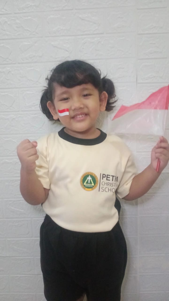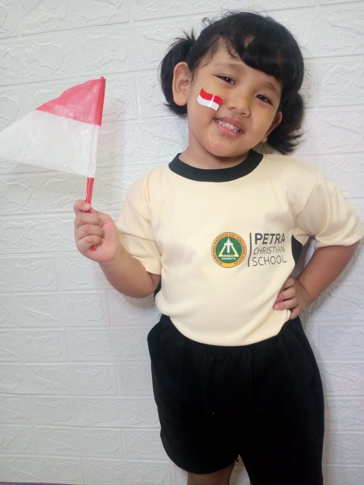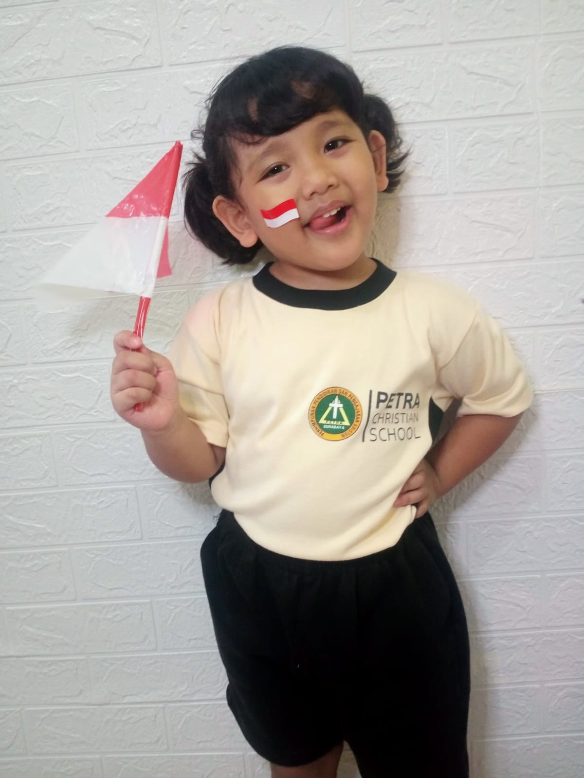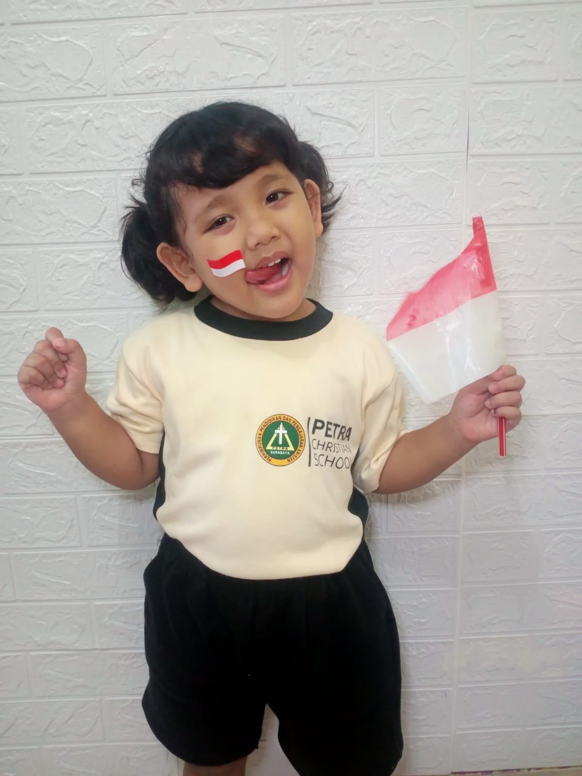 “… hari lahirnya Bangsa Indonesia. Merdeka! Sekali merdeka tetap merdeka…” adalah kalimat yang saya nyanyikan ketika menyanyi Lagu Hari Merdeka dengan lantang dan semangat. Hari ini pada tanggal 18 Agustus, sekolahku KB-TK Kristen Petra 13 ikut merayakan HUT ke-76 Kemerdekaan Republik Indonesia. Ibu guru mengajakku dan teman-teman membawa bendera dan menyanyikan Lagu Hari Merdeka. Selain menyanyi, Ibu guru juga mengajak kita semua untuk berdoa bersama-sama mendoakan Bangsa Indonesia. Ibu guru menceritakan bahwa setiap tanggal 17 Agustus, Bangsa Indonesia merayakan hari kemerdekaan artinya Bangsa Indonesia merdeka dari penjajahan yang dilakukan oleh bangsa asing selama ratusan tahun berkat perjuangan dari para pahlawan nasional dan juga pahlawan yang ada di Indonesia. Ibu guru juga mengatakan bahwa perjuangan para pahlawan dahulu tidaklah mudah karena mereka harus berperang dengan pedang, senapan dan juga bambu runcing.