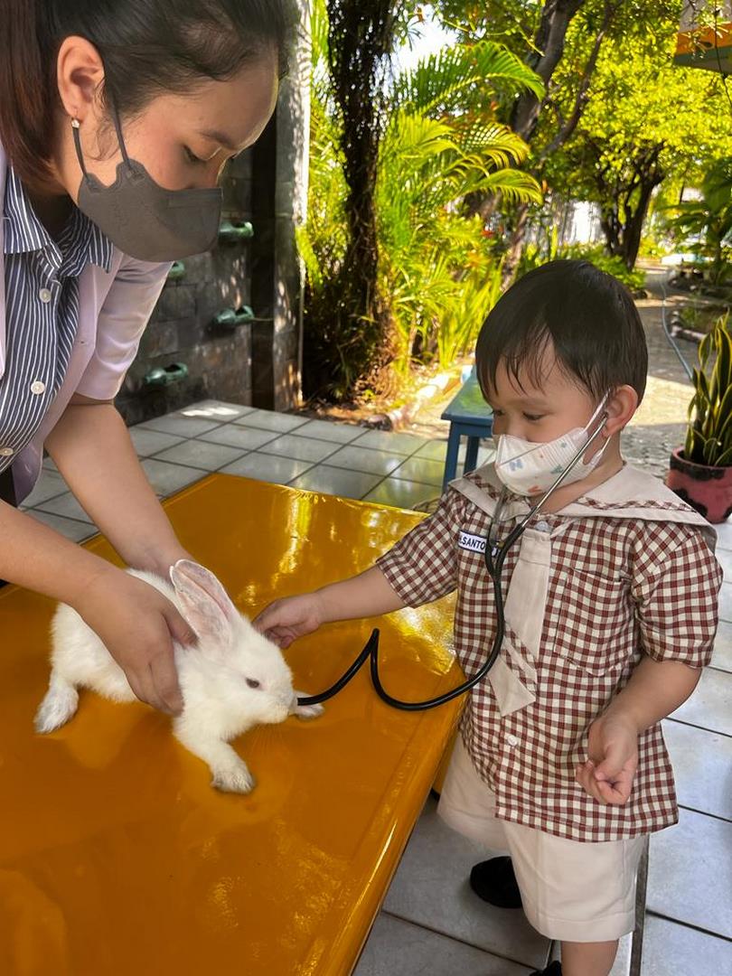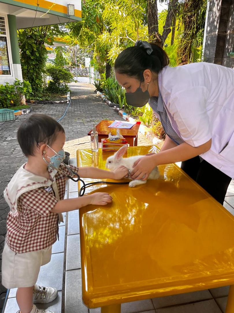 Saat itu, Ibu guru mengenalkan kami pada seorang mahasiswa jurusan kedokteran hewan, yang akan mengajak kami bermain dan mengenal tentang pekerjaan sebagai dokter hewan. Kami diajak mengenal berbagai macam binatang peliharaan, dan bagaimana cara merawatnya. Kami juga diperbolehkan memegang binatang, lho. Ternyata kalau memegang binatang harus pelan-pelan dan disayang, tidak boleh ditekan atau dipegang terlalu kuat, nanti hewannya bisa kesakitan. Selain itu, binatang juga harus diberi makan, minum, dan tak lupa kandangnya juga harus selalu dibersihkan. Kalau binatang peliharaan kita sakit, kita dapat membawanya ke dokter hewan untuk diperiksa.