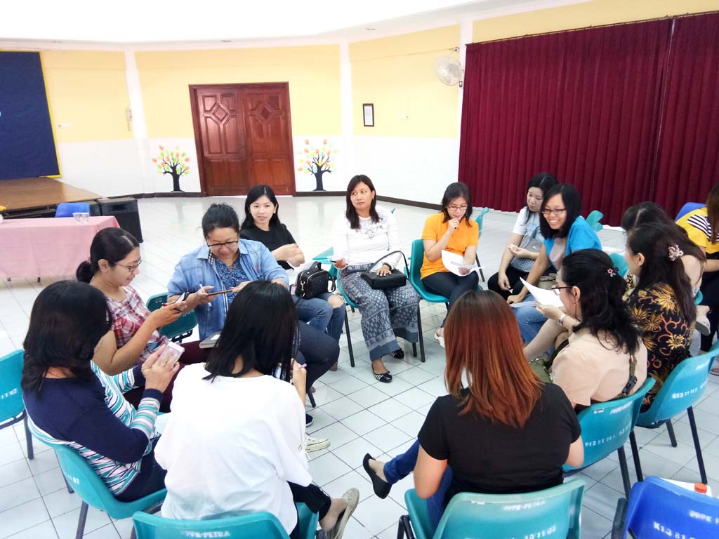 Sebelum memasuki sesi seminar orangtua diajak berdiskusi terlebih dahulu. Diskusi yang dilakukan dalam kelompok-kelompok ini diadakan dengan tujuan agar orangtua dapat saling berbagi informasi mengenai tekhnik pengasuhan yang telah dilakukan dalam keluarga. Agar diskusi dapat berjalan lebih terarah, pihak sekolah telah menyiapkan beberapa pertanyaan untuk dijawab bersama oleh mashing-masing kelompok.