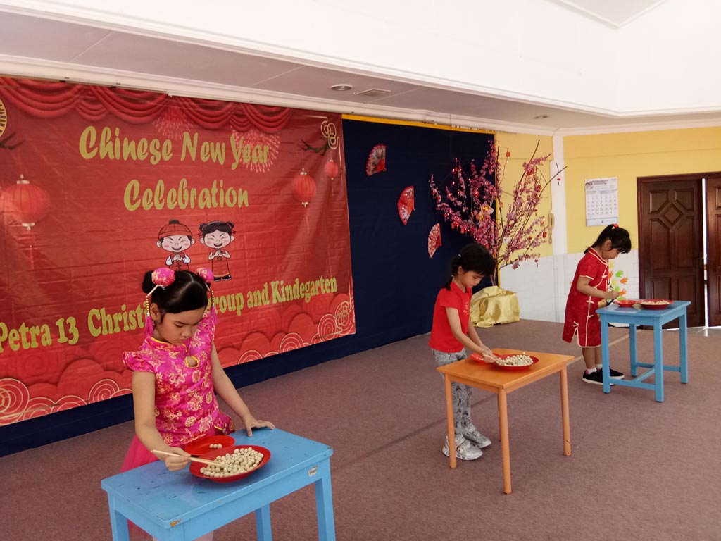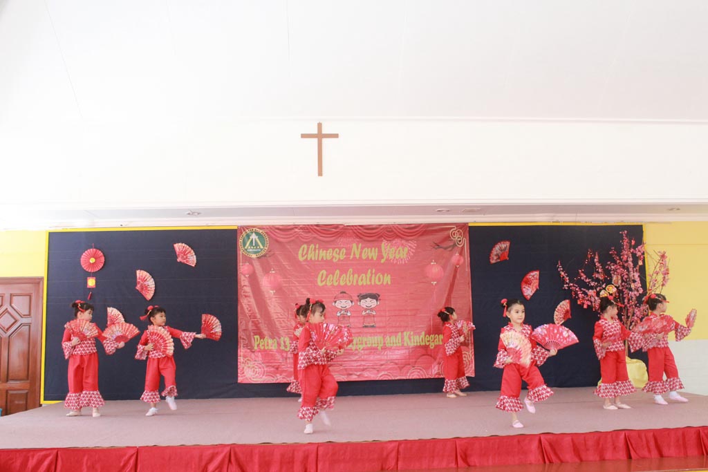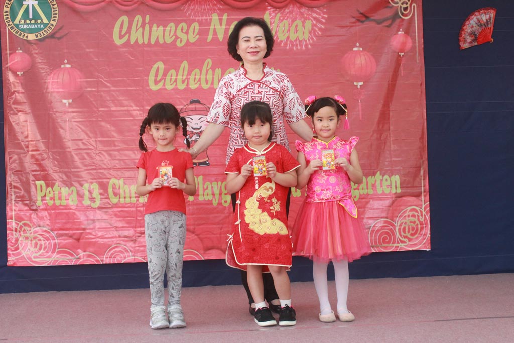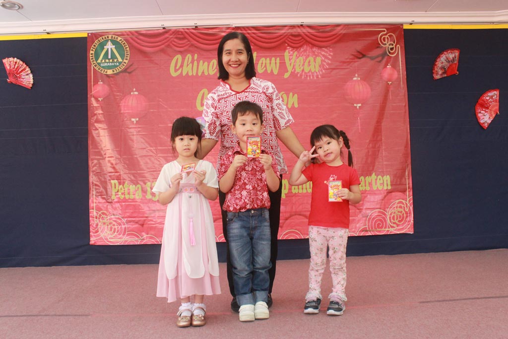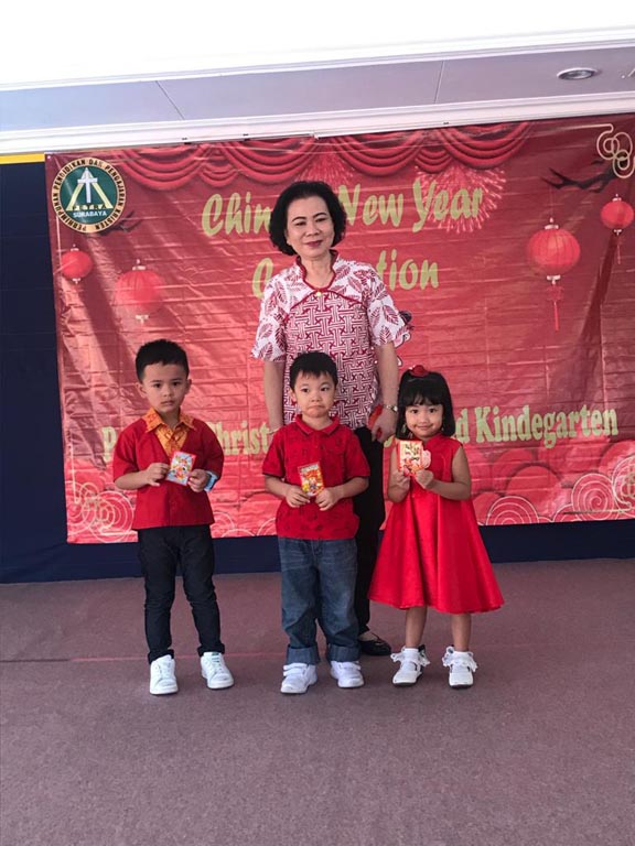 Perayaan imlek di sekolah kami diadakan pada hari Jumat, 31 Januari 2020. Kami, siswa-siswi KB dan TK, datang ke sekolah dengan kostum bernuansa Imlek yang didominasi warna merah, lengkap dengan aksesoris topi dan pita. Tidak hanya pakaian kami yang didominasi warna merah, tetapi hiasan sekolah dan seragam guru-guru kami juga berwarna merah. Setelah mengikuti beberapa kegiatan di kelas kami masing-masing ternyata guru-guru kami mengajak kami untuk mengikuti permainan yang seru banget! Seperti lomba mengupas jeruk untuk murid KB serta lomba menyumpit kacang dan permen untuk murid TK. Alhasil, yang terbaiklah mendapatkan angpao!