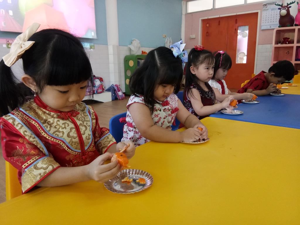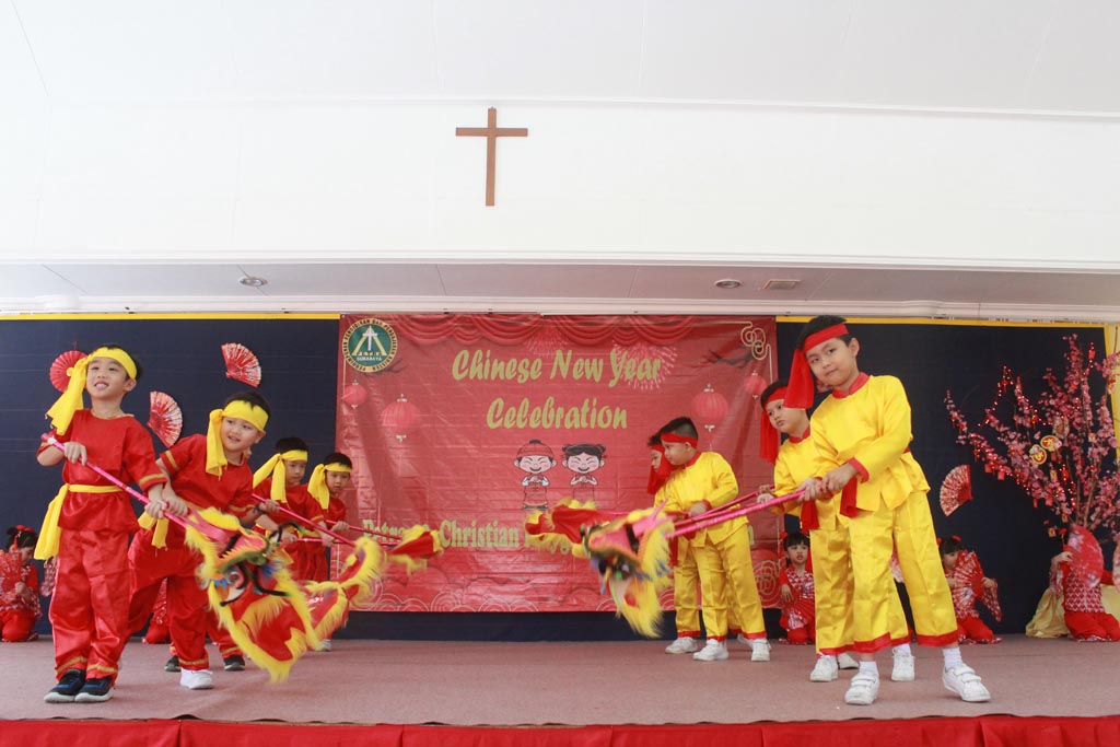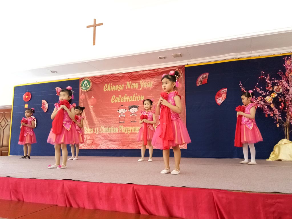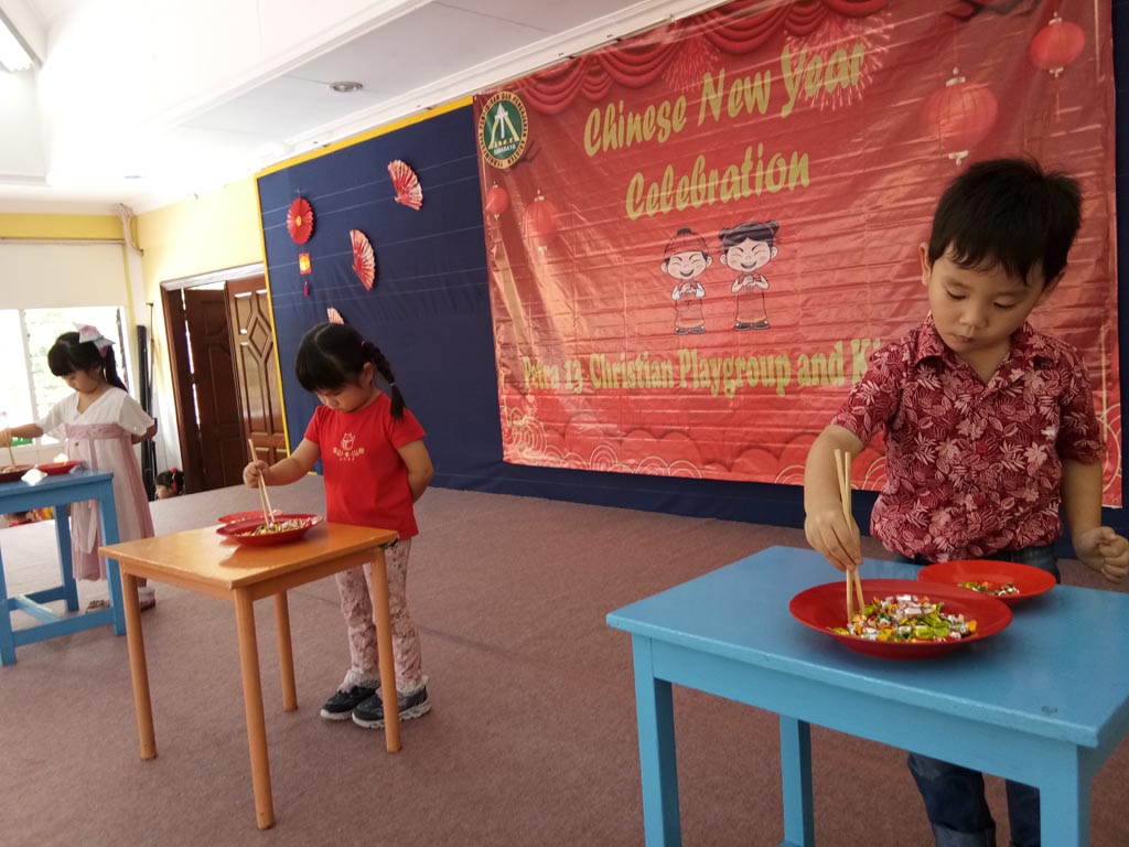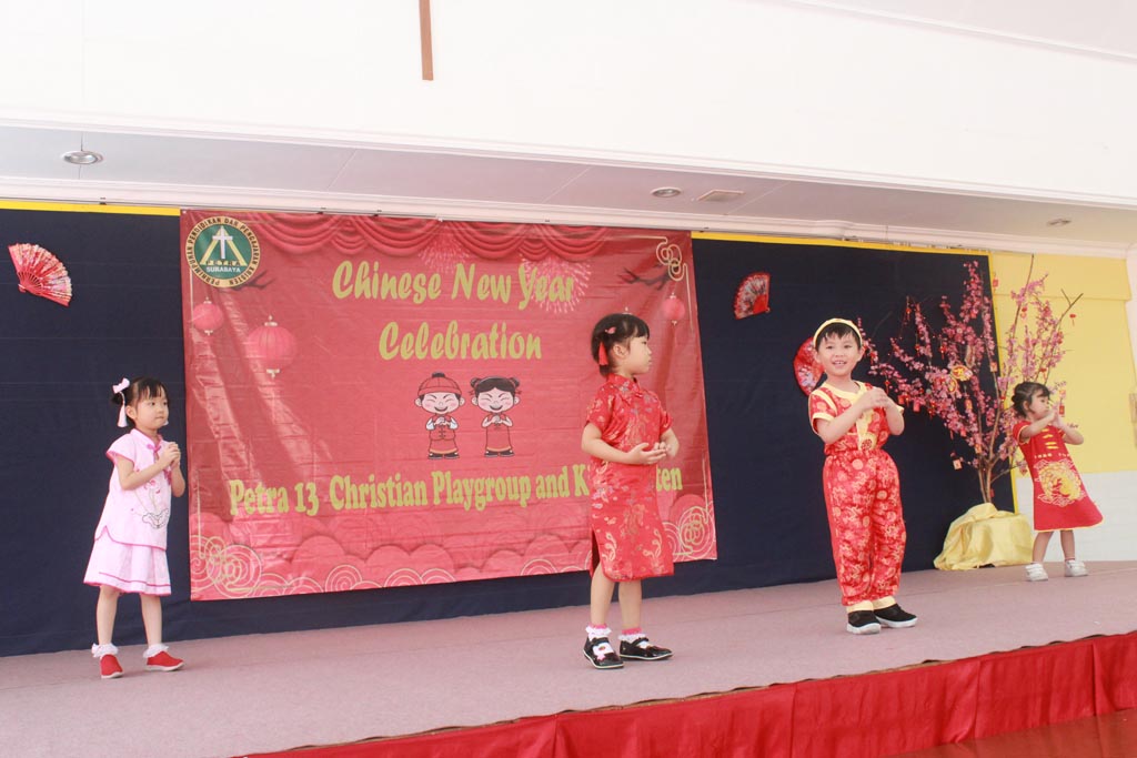 Perayaan imlek di sekolah kami diadakan pada hari Jumat, 31 Januari 2020. Kami, siswa-siswi KB dan TK, datang ke sekolah dengan kostum bernuansa Imlek yang didominasi warna merah, lengkap dengan aksesoris topi dan pita. Tidak hanya pakaian kami yang didominasi warna merah, tetapi hiasan sekolah dan seragam guru-guru kami juga berwarna merah. Setelah mengikuti beberapa kegiatan di kelas kami masing-masing ternyata guru-guru kami mengajak kami untuk mengikuti permainan yang seru banget! Seperti lomba mengupas jeruk untuk murid KB serta lomba menyumpit kacang dan permen untuk murid TK. Alhasil, yang terbaiklah mendapatkan angpao!